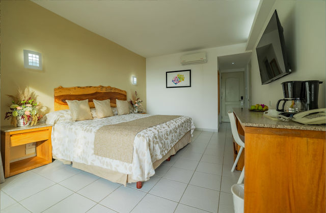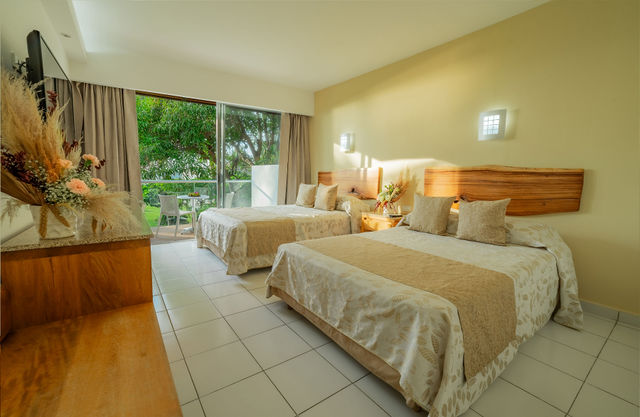 Comfortable rooms, air conditioning, HD TV, telephone, free Wi-Fi, coffee maker, desk, hair dryer, and safe. Elegant bathroom with marble wash basin countertop and tempered glass shower. For comfort, you can choose Standard Deluxe rooms with 1 king-size or 2 double beds.